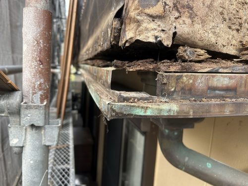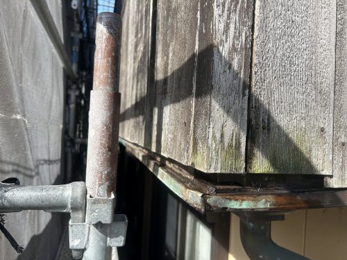 ベランダドレンの不良で漏水し、軒天、外壁下地に傷みが発生しておりました。