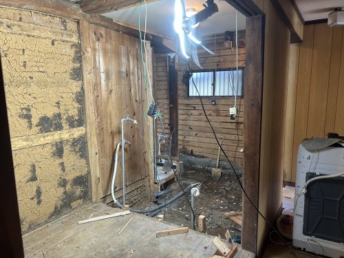 昨日、今日で新城市のお客様(V様)の水廻り改修工事で 先行してお風呂、洗面脱衣の改修工事に着工。タイル貼りの風呂の解体、土間コンクリートはつり、地中埋設残材の片付け を行いました。