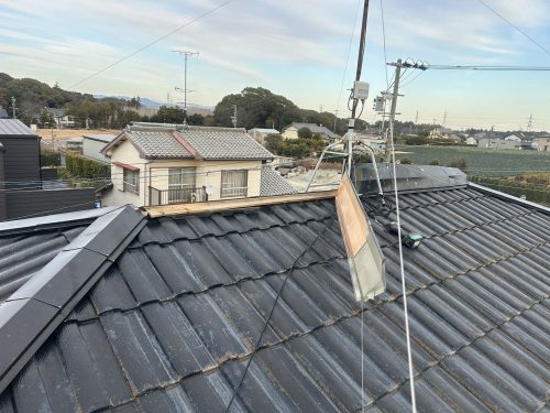 今朝、湖西市岡崎のお客様より強風で棟板金が飛散して工事のご依頼がありましたので、応急対応させていただきました。