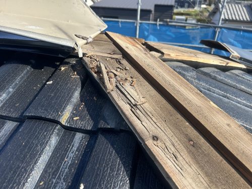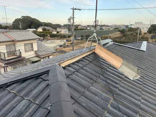 1か月ほど前の強風で、棟板金が飛散してしまい(応急対応済)本日棟板金の取替工事を行いました。
