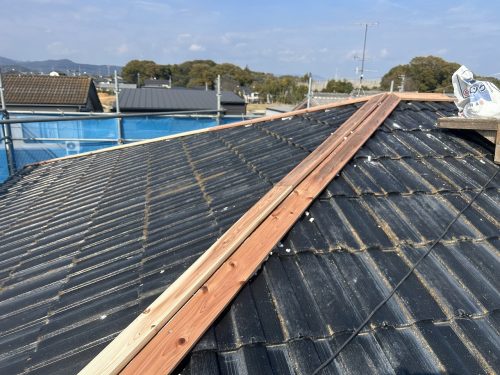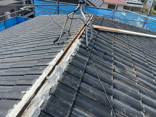 今日は、湖西市岡崎のお客様(W様)の屋根修理(セメント瓦屋根)、屋根塗装工事に着工しました
