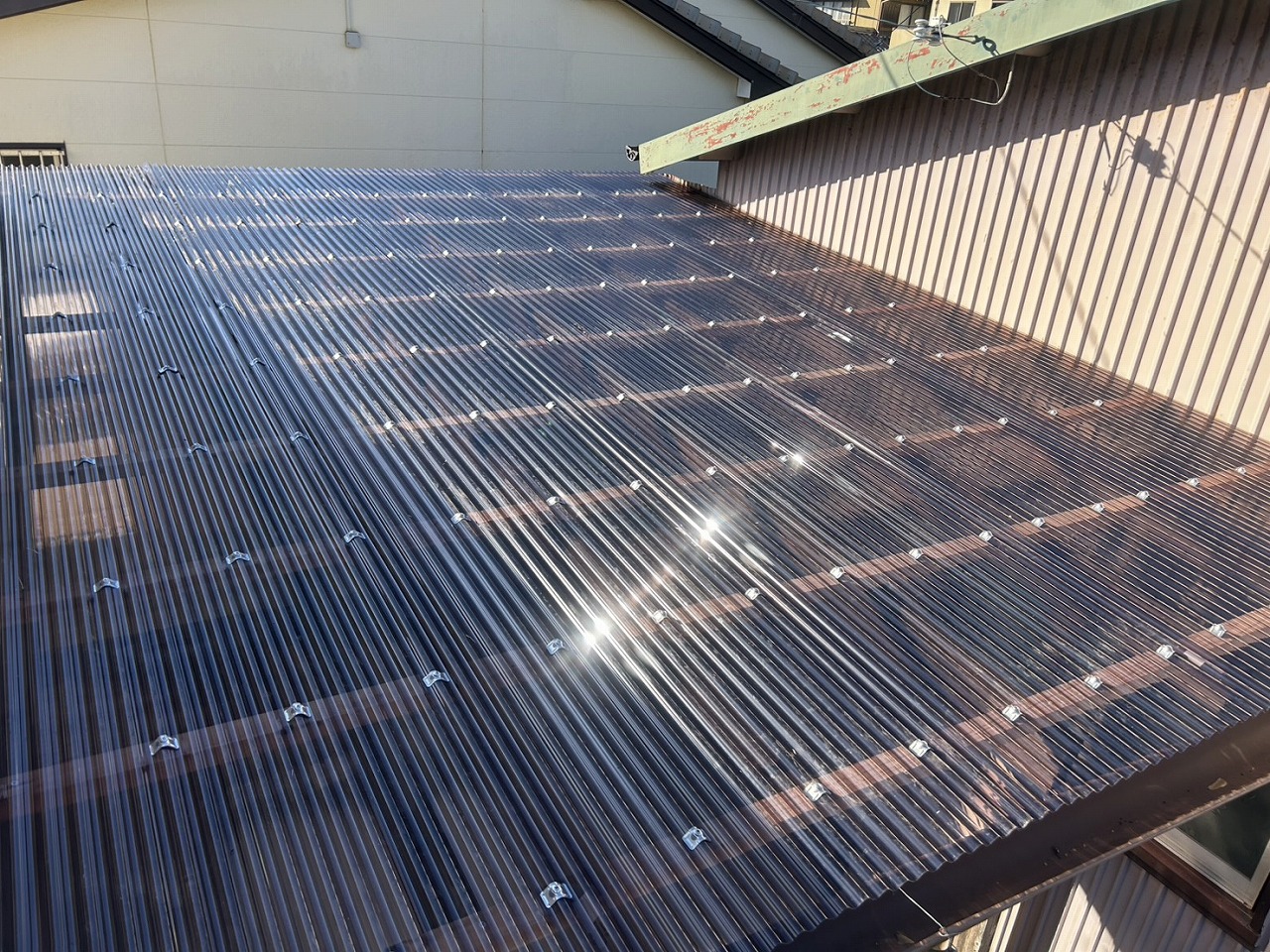 今日は、湖西市新居町のお客様(H様)の木製テラス屋根の貼り替えを行いました。 ポリカ波板の劣化がひどく強風で飛散してしまいました。 木製テラス屋根の勾配が緩いため、大雨時に逆流しないように ポリカ波板長さを特注で成型して ・・・ 詳細