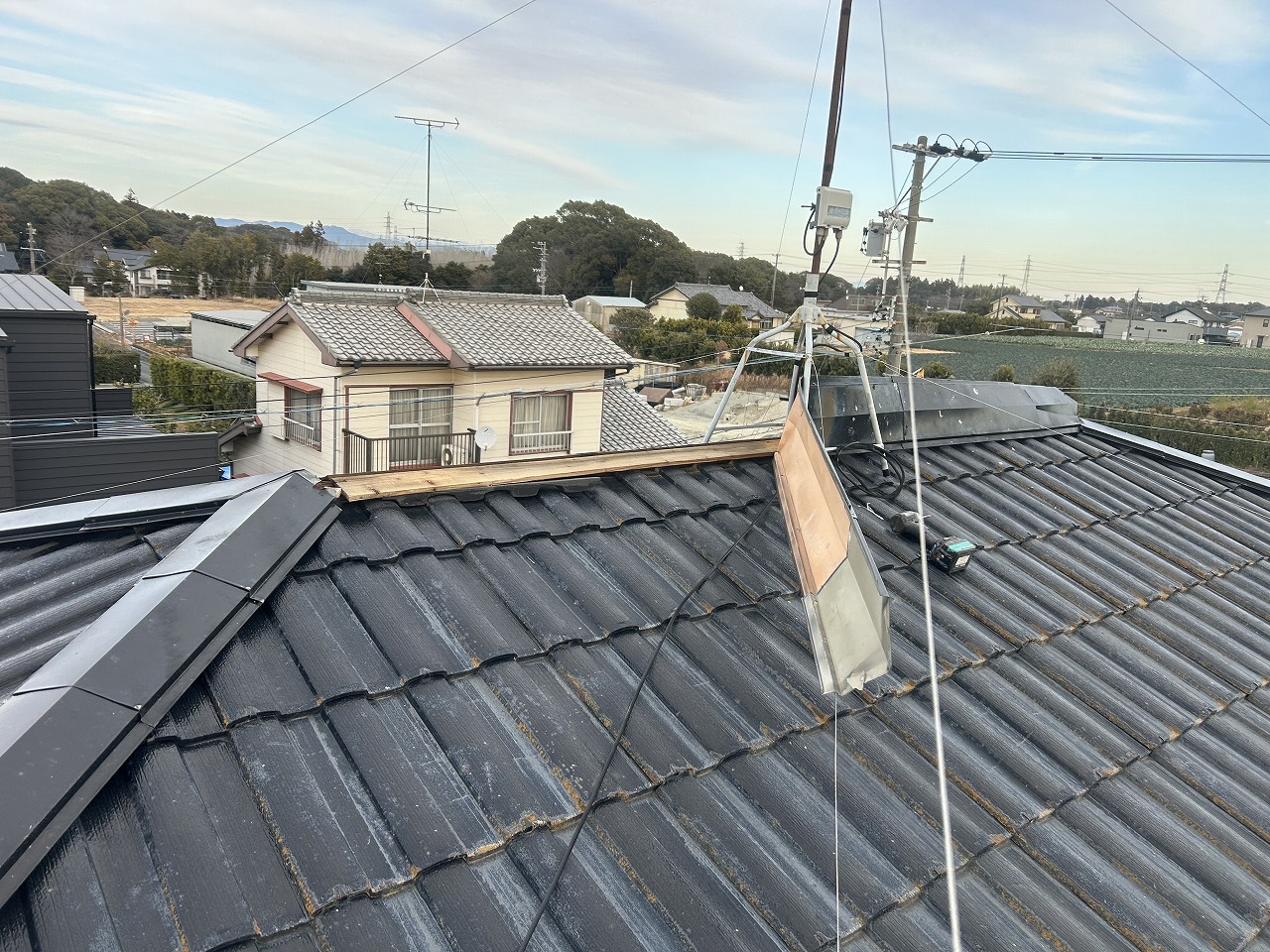 今朝、湖西市岡崎のお客様より強風で棟板金が飛散して工事のご依頼がありましたので、応急対応させていただきました。 近隣の方へ飛散してしまうおそれがあり、心配されておられましたので本日夕方対応しました。(仮復旧)